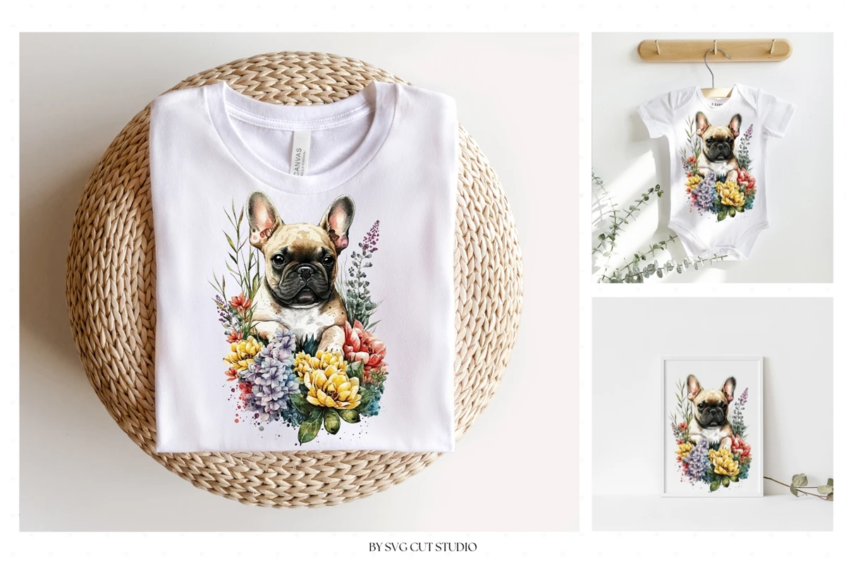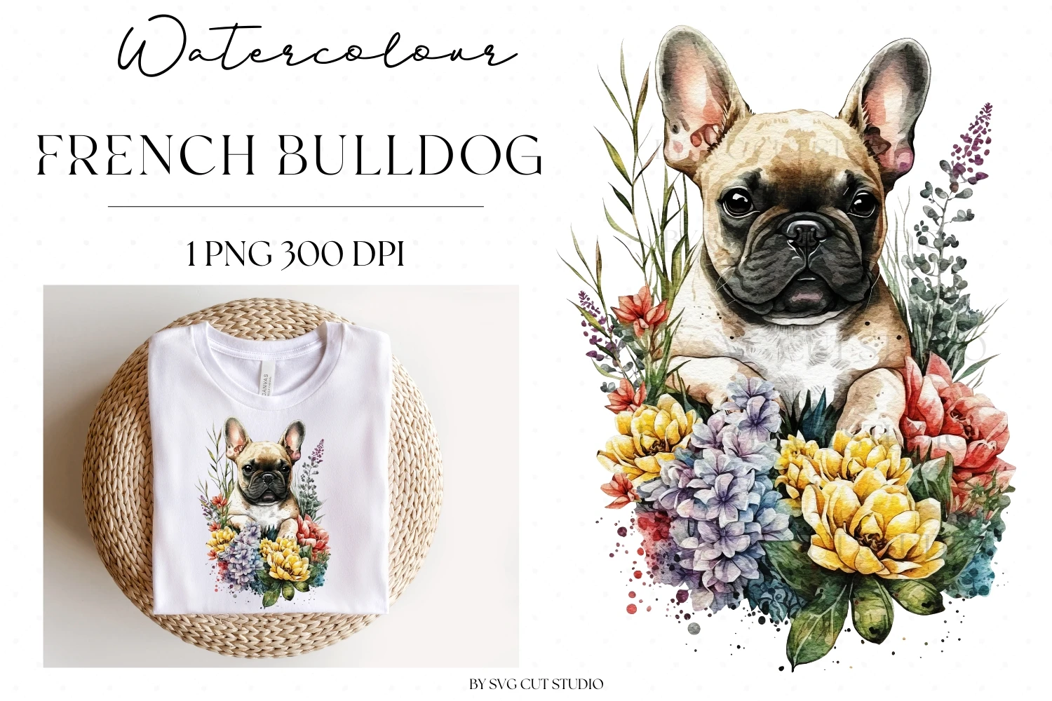 Watercolour Floral French Bulldog Sublimation PNG Design.