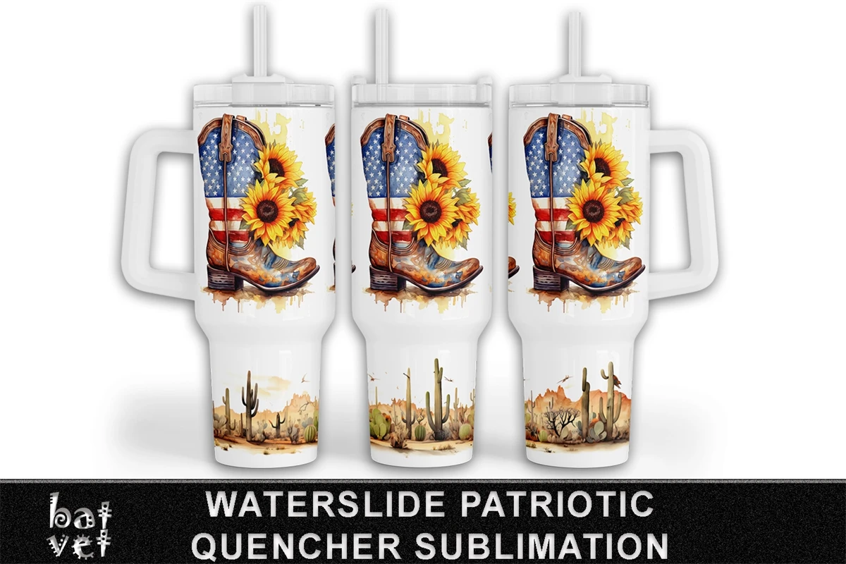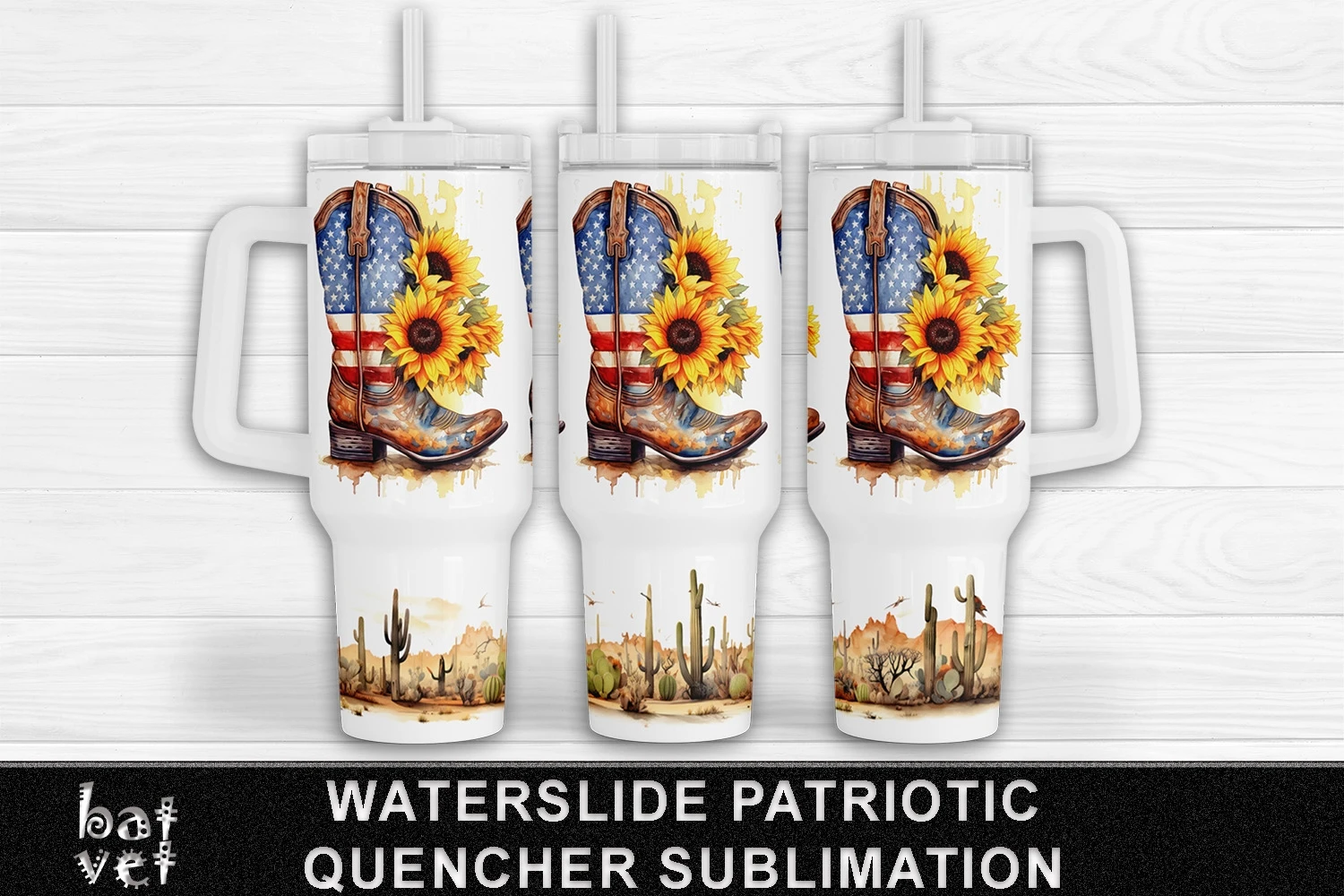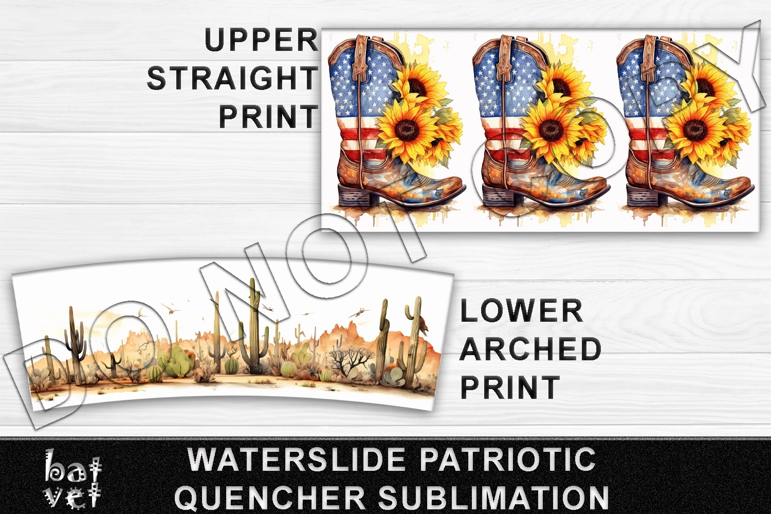 Waterslide Quencher Wrap Watercolor Patriotic Tumbler 40 Oz USA Flag, Cowboy Boots, Sunflowers, Desert, Cactuses, Landscape Sublimation Wrap. Two Part Sublimation - Upper Straight and Lower Arched Print. Both Wraps with and without White Color.