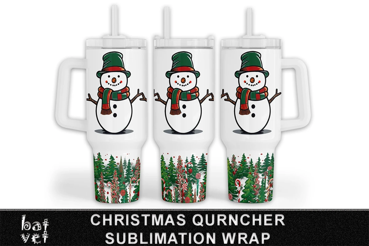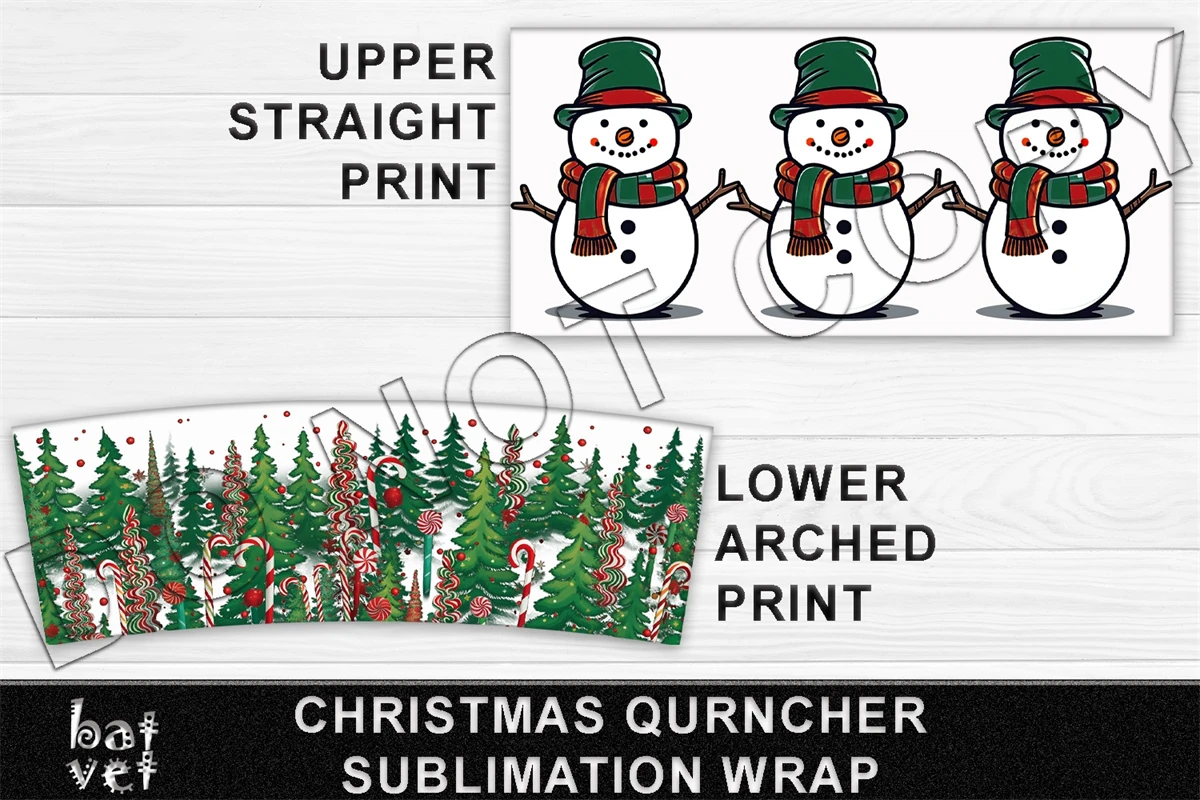 Waterslide Wrap Christmas Tumbler 40 Oz Quencher Snowman, Christmas Trees, Christmas Candy Sublimation Wrap. Two Part Sublimation - Upper Straight and Lower Arched Print. Both Wraps with and without White Color.
