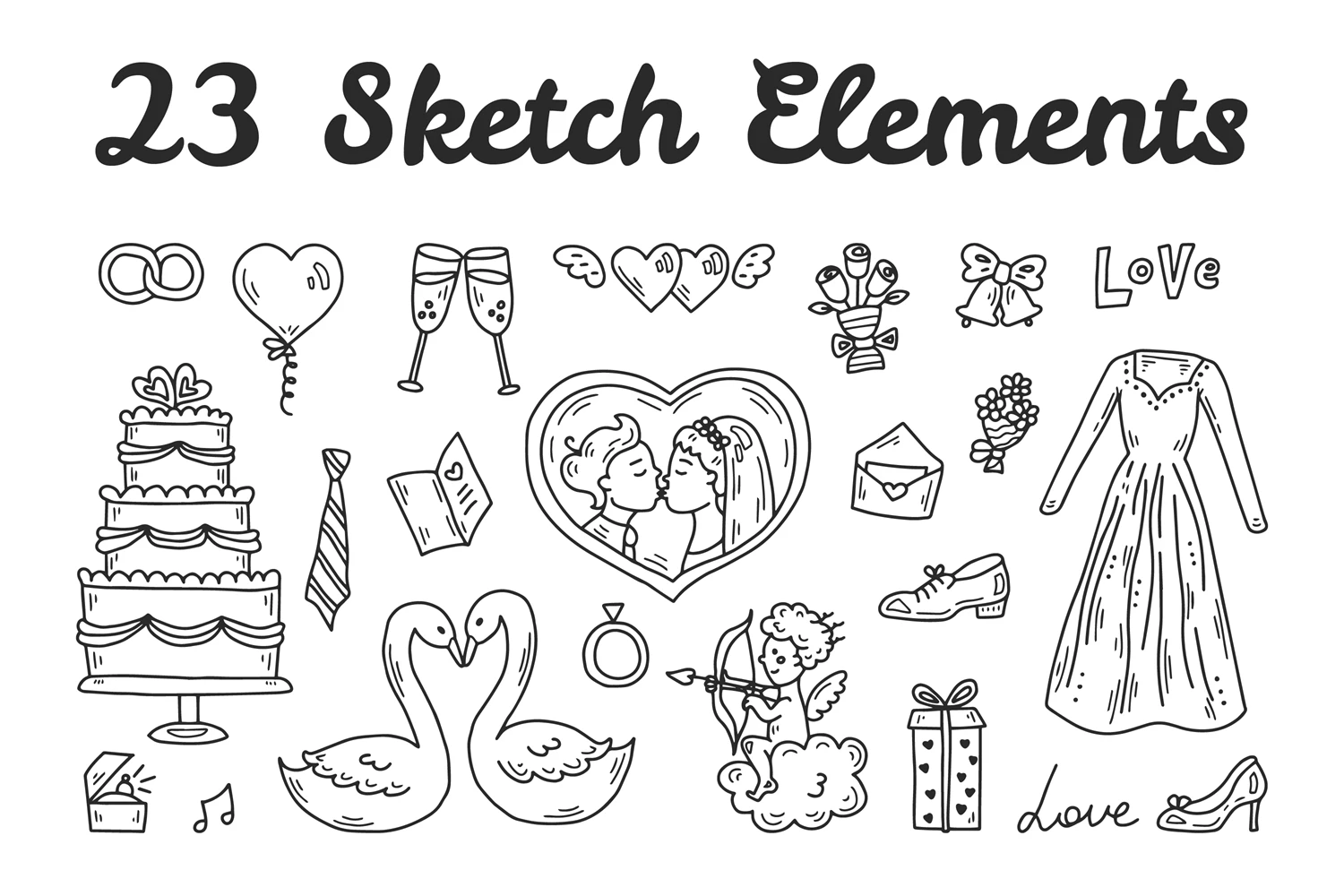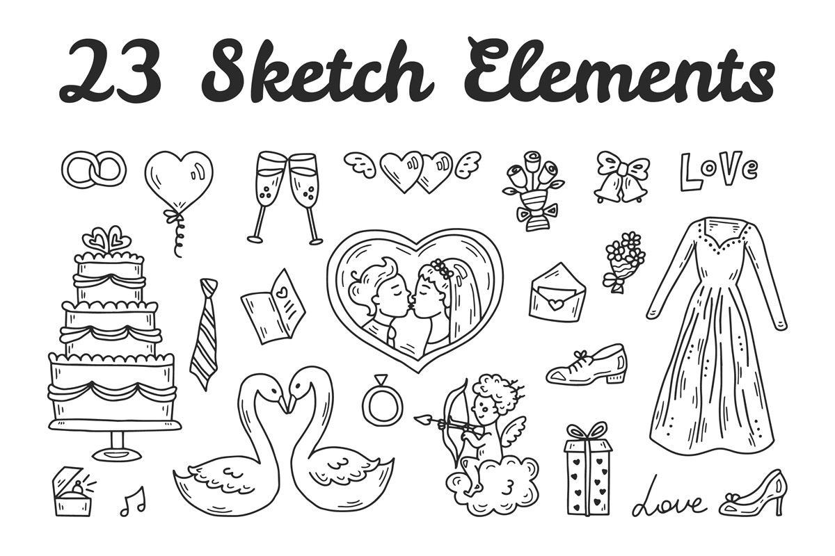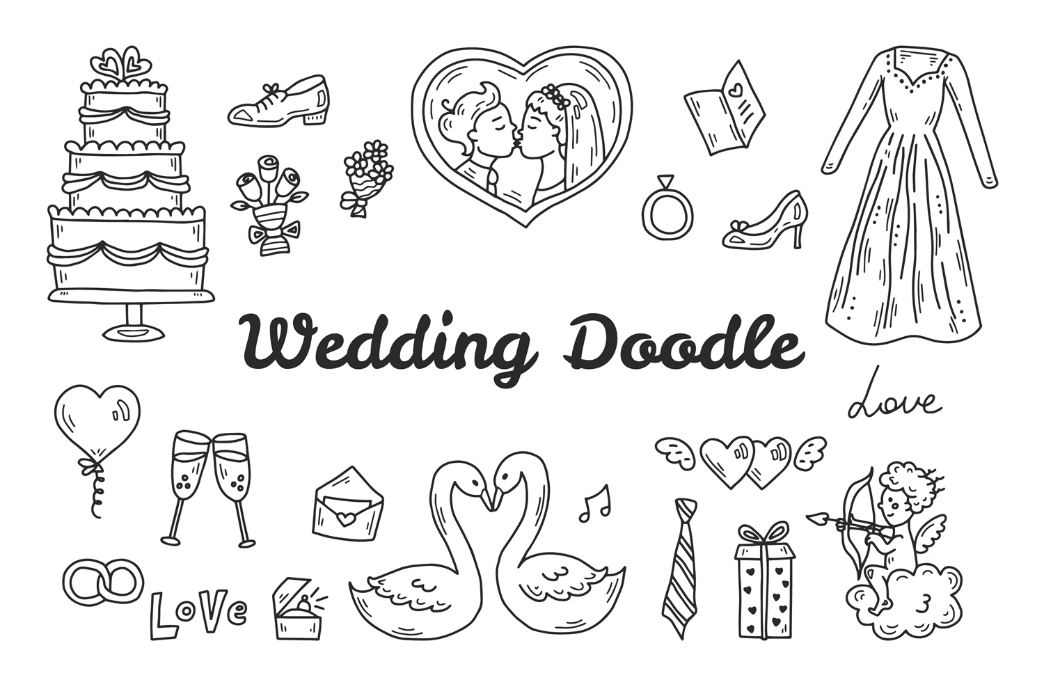 Wedding doodle clipart. Hand-drawn comic wedding elements in sketch style. Funny wedding ceremony icons with wedding dress and cake. Black ink drawing. Vector illustration.