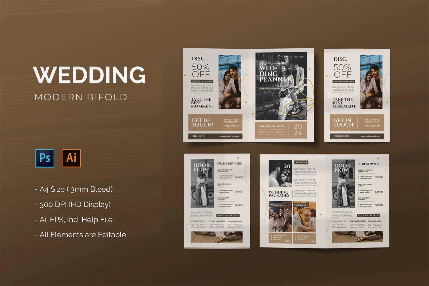 Wedding Planner - Bifold Brochure Here is a bifold brochure we created for you. It's basic yet sophisticated, making it ideal for promoting any of your business's services or products. It is very easy to customize. I hope you like it; don't forget to rate it, thank you.