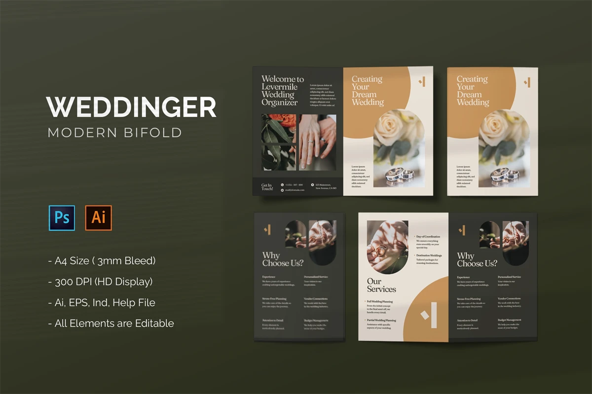 Weddinger - Bifold Brochure This bifold brochure design template offers a visually engaging canvas to showcase your message, products, or services. With a well-organized layout and attention-grabbing graphics, each panel tells a part of your story.