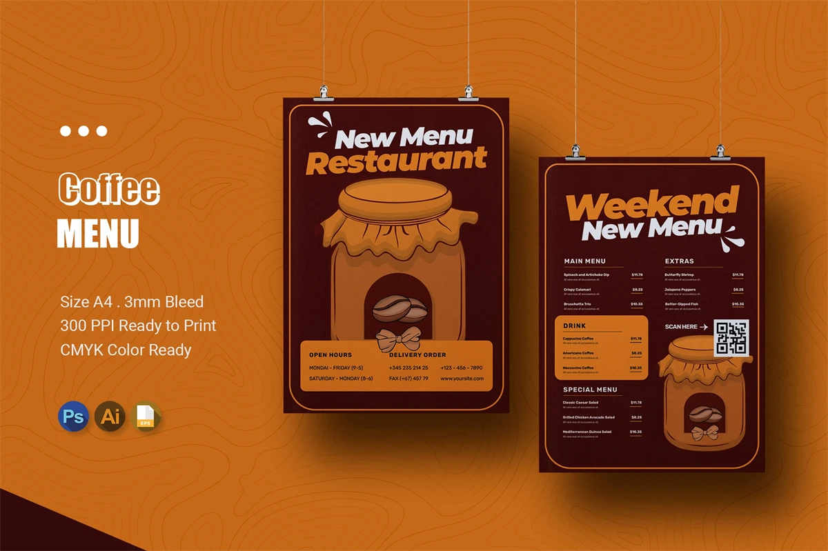 This Menu is great for displaying your restaurant menu in an eye pleasing way. Attracting customers with an easy-to-read restaurant menu certainly makes closing easier, right? easily editable according to your needs, this restaurant menu is perfect for promos, cafes, hotels, resort shops online etc.