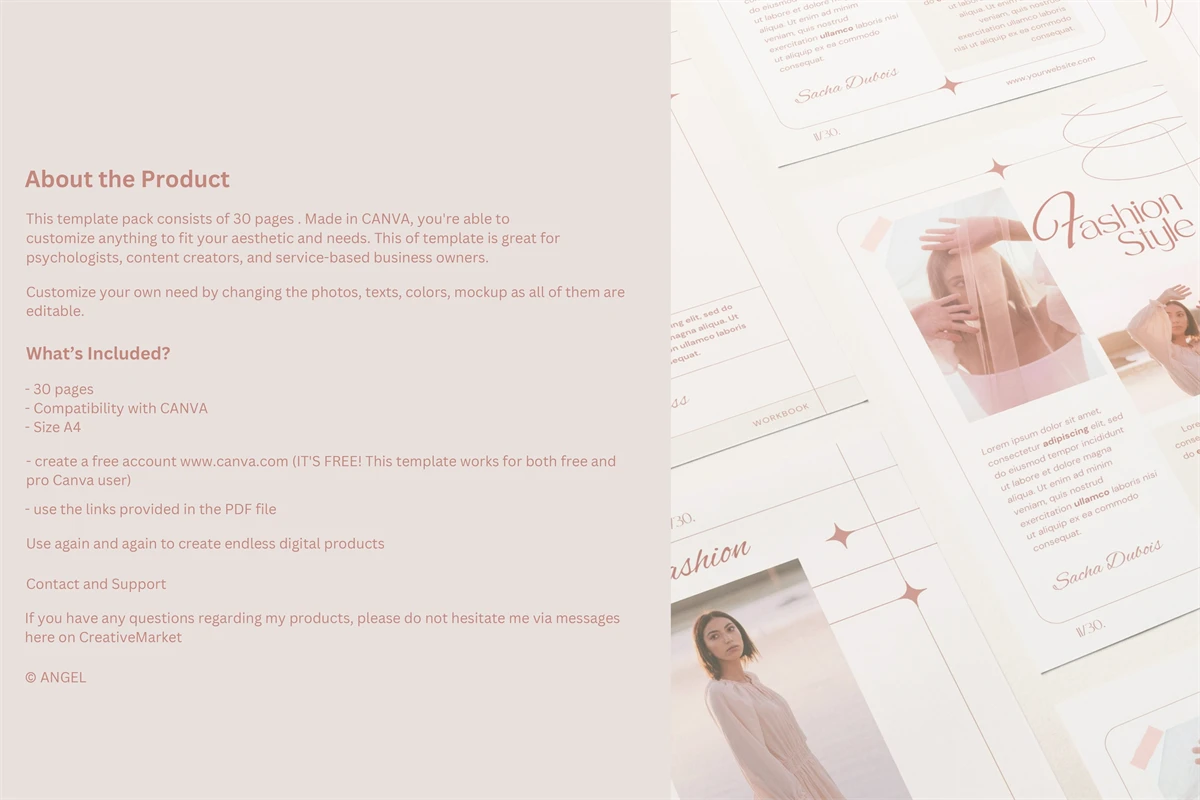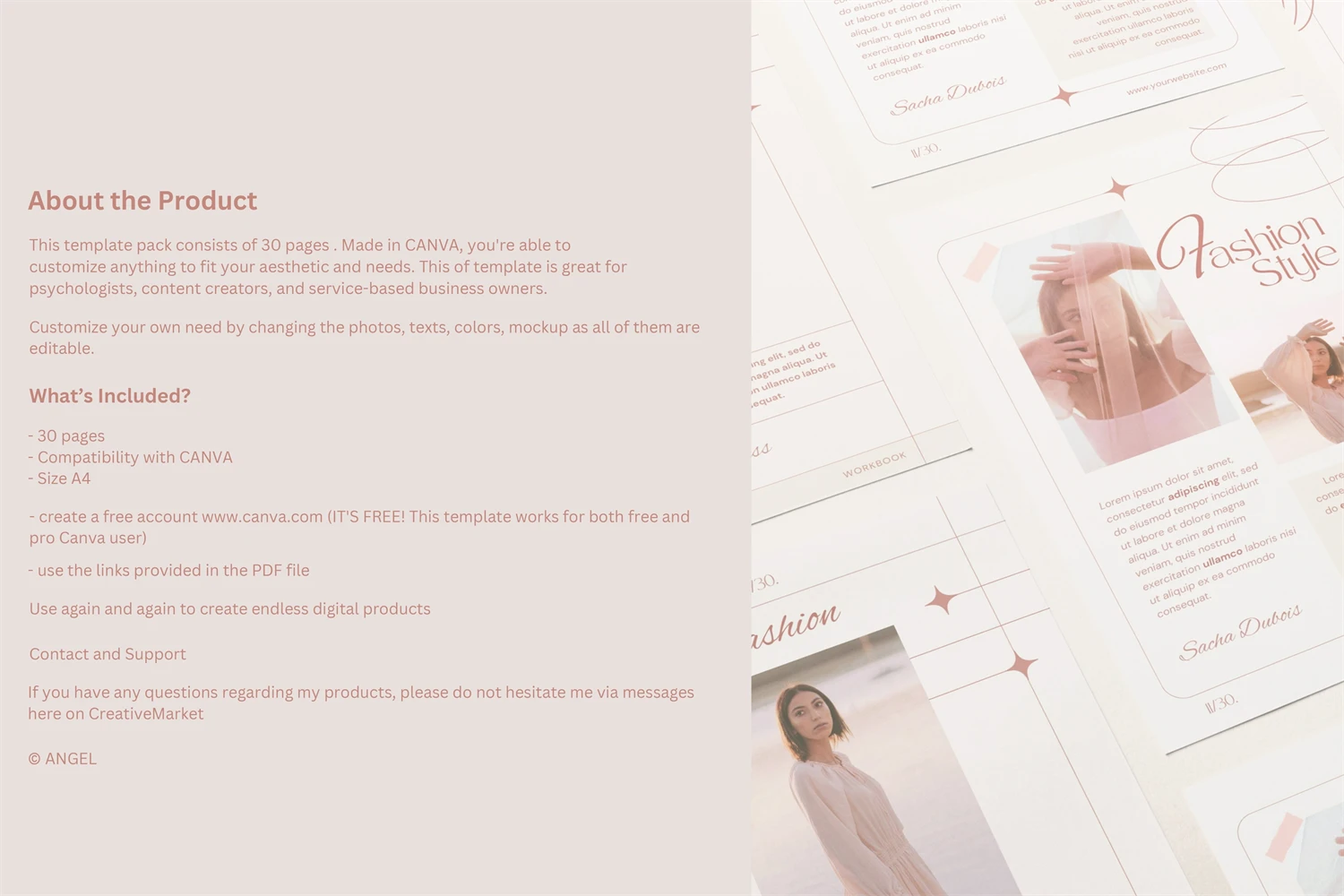 This template pack consists of 30 pages . Made in CANVA, you're able to customize anything to fit your aesthetic and needs. This of template is great for psychologists, content creators, and service-based business owners.