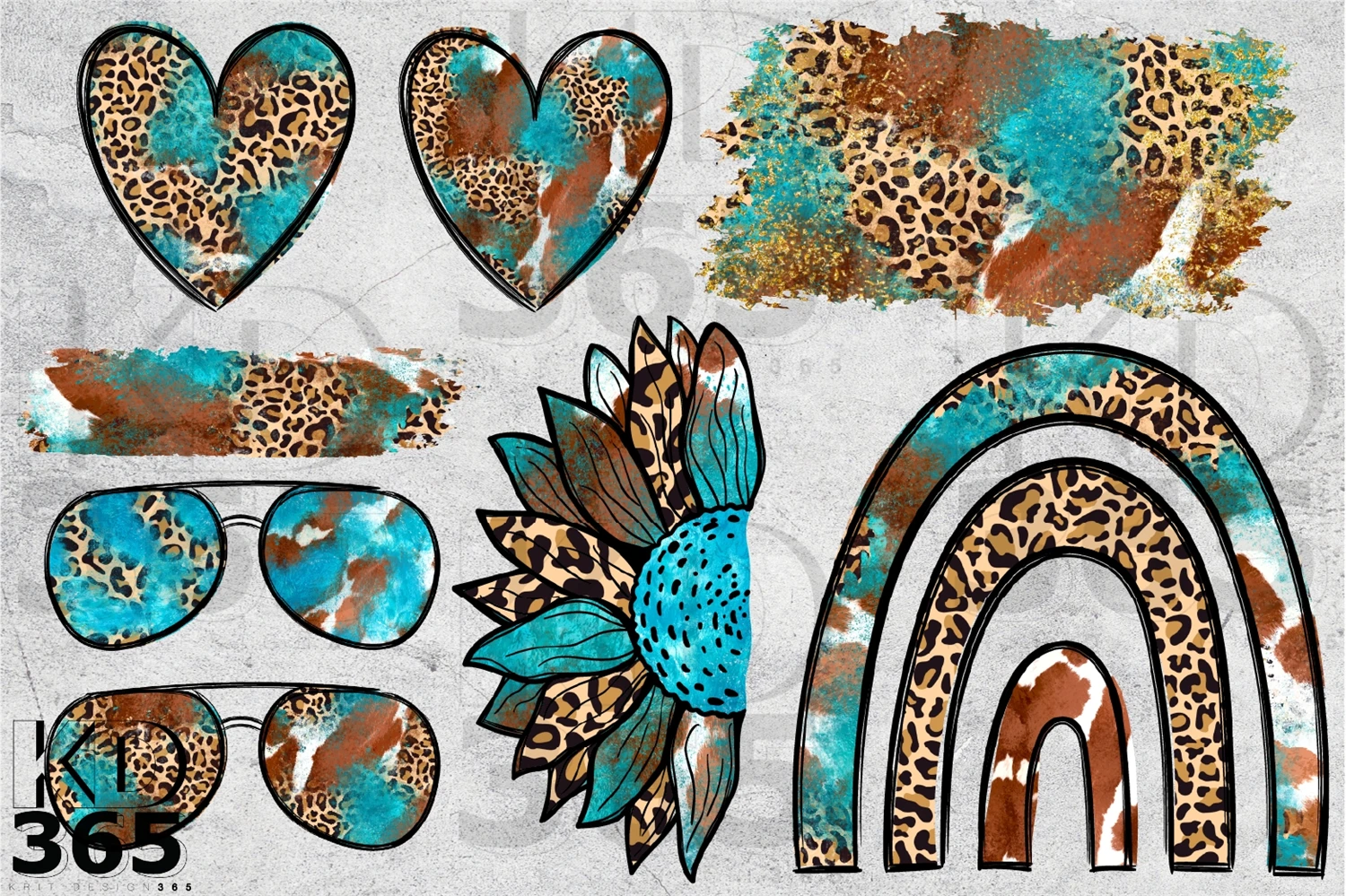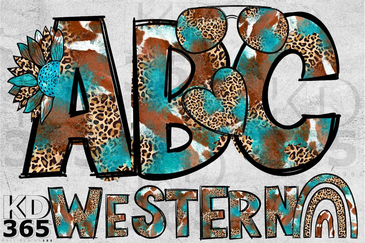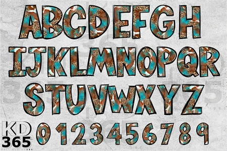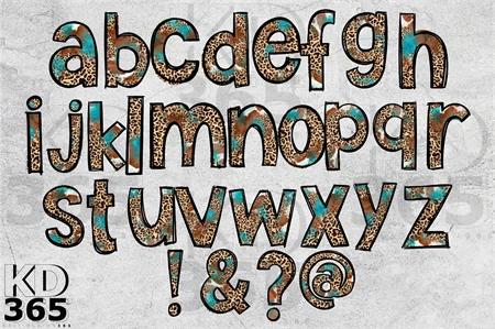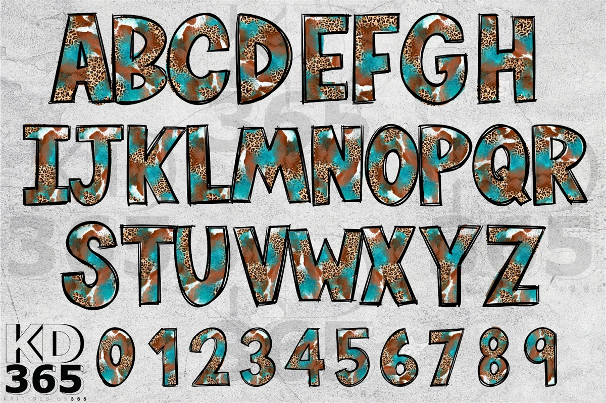 This Western Alphabet PNG Sublimation Design features a captivating combination of Leopard Cowhide Skin and Turquoise Texture.