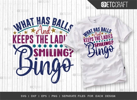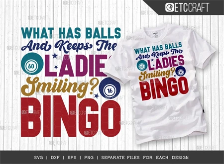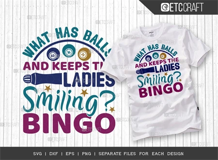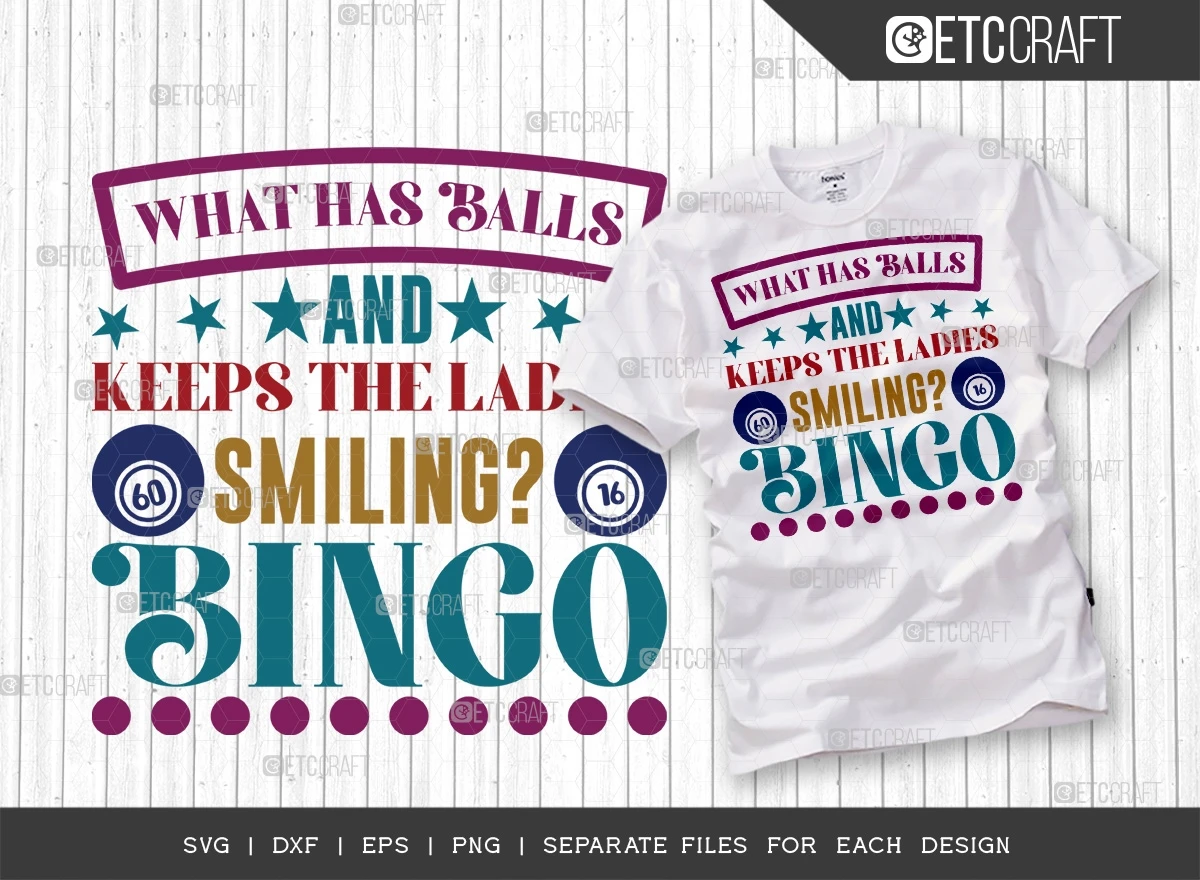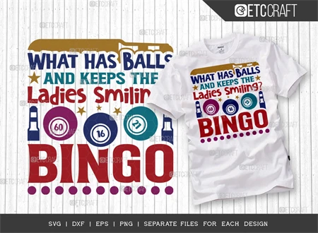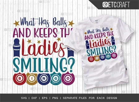 Introducing the "What Has Balls And Keeps The Ladies Smiling SVG Bundle" - a fun and unique t-shirt design that is sure to delight bingo lovers and bring a smile to their faces. This versatile SVG bundle offers a range of benefits and uses, making it a must-have for any bingo enthusiast. Read on to discover why you should buy this design: