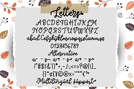 Whimsy Foliage is a delightful script font that combines a cute retro style with the whimsical beauty of foliage. This font exudes a playful charm, reminiscent of vintage lettering with a modern twist. Each letter is meticulously crafted, capturing the essence of hand-drawn strokes and intricate details. The fusion of whimsy and foliage brings a touch of natures magic to your designs, making it perfect for invitations, greeting cards, logos, branding, and more. Let the whimsical foliage of this font add a unique and enchanting element to your creative projects.