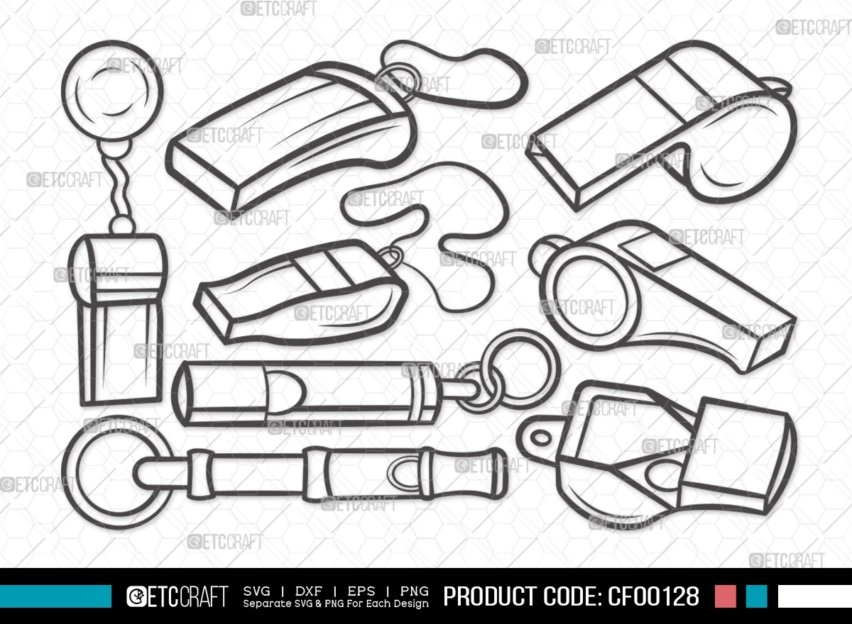 Take the lead in the game with our Whistle Outline Sports Coach Whistle SVG Cut File Bundle. This collection offers a range of whistle-inspired designs in a sleek outline style, capturing the essence of sports and coaching. Whether you're a sports enthusiast, a coach, or a design aficionado, this bundle provides the perfect tools to amplify your projects with a sporty touch.