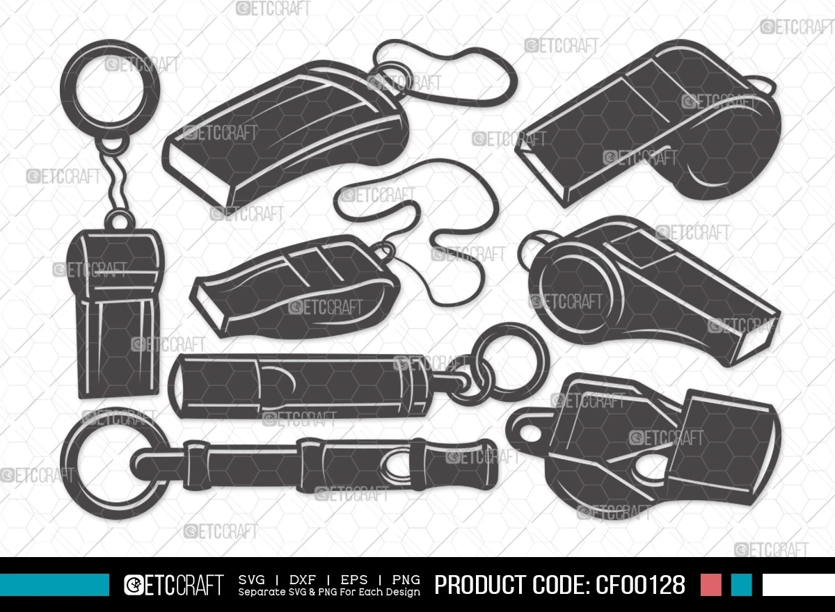 Score big with our Whistle Silhouette Sports Coach Whistle SVG Cut File Bundle. This collection features a range of sleek and dynamic silhouette designs of sports whistles, capturing the essence of sports and coaching. Whether you're a sports enthusiast, a coach, or a design aficionado, this bundle offers the perfect tools to elevate your projects with a sporty touch.