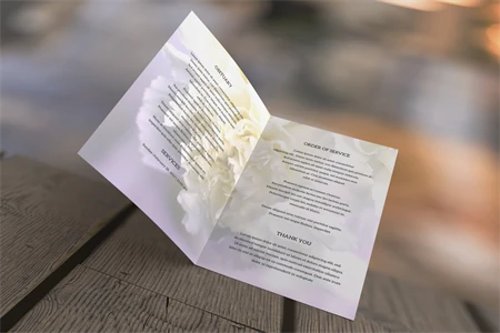 Funeral program template 4 page for women with beautiful White carnation floral decoration. This template is a great way to honor your loved one.