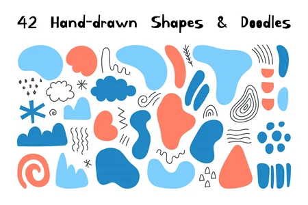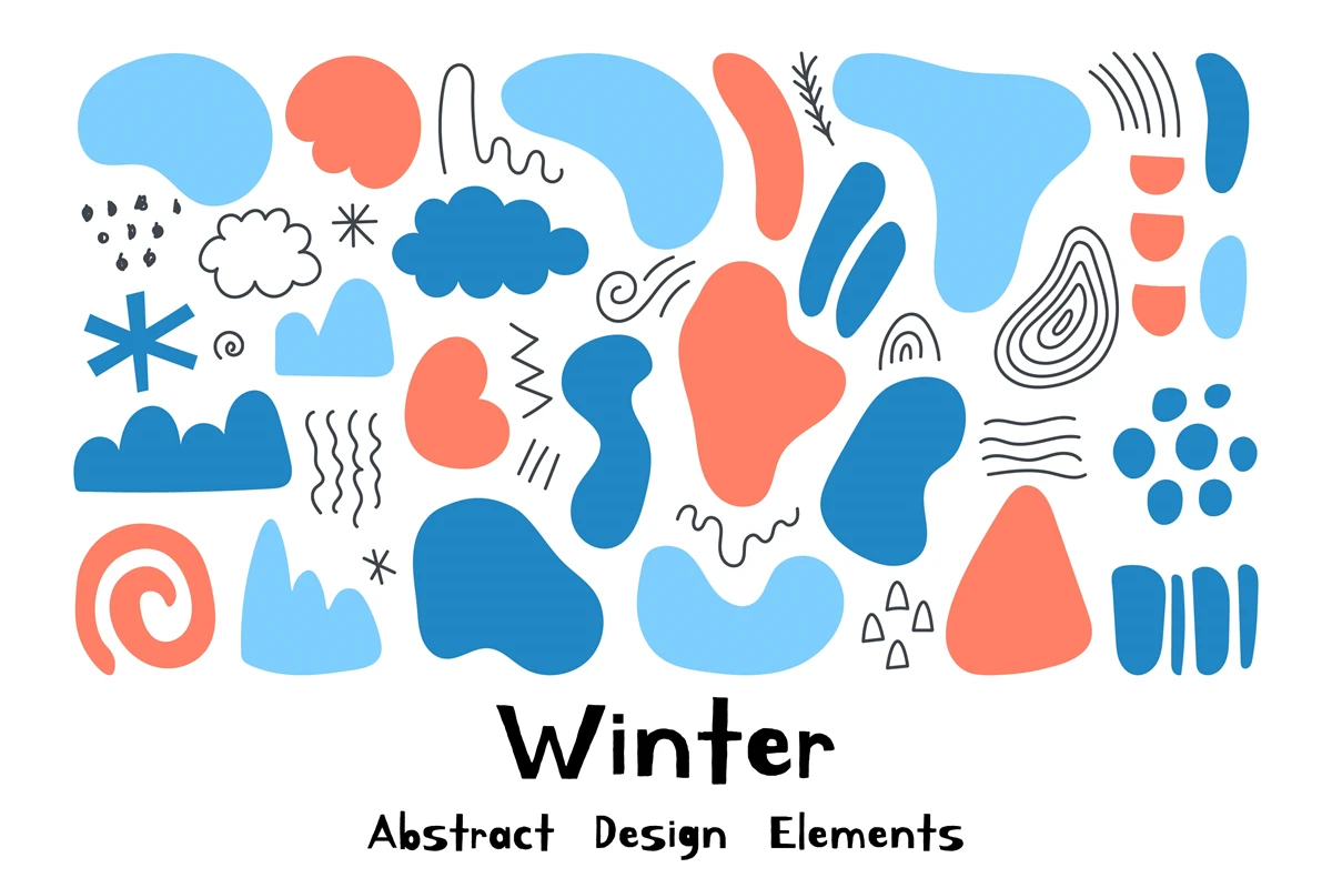 Colorful hand-drawn abstract shapes and doodles for winter design. Hand-painted liquid and wavy organic forms. Fluid geometric elements for kids, greeting cards, posters, banners, social media, priducts design. Vector illustration.
