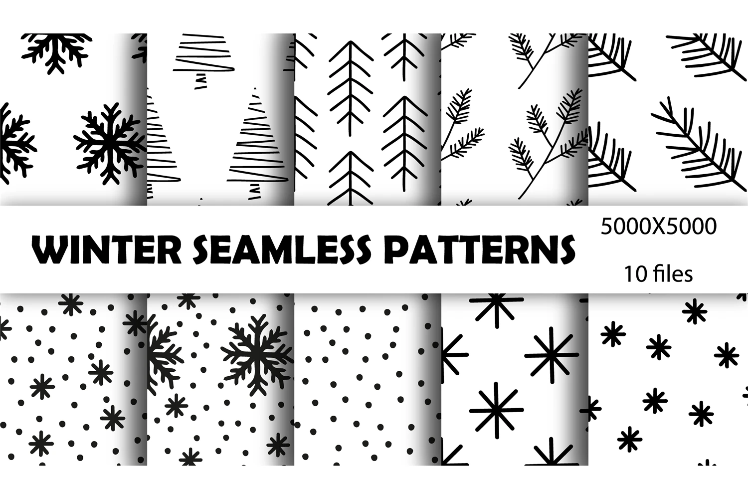 10 Beautiful Hand drawn Winter seamless patterns, Christmas and New Year Digital Papers. Christmas trees, Winter forest, snowfall and snowflakes texture Digital Papers Collection. Winter Abstract Print Sublimation