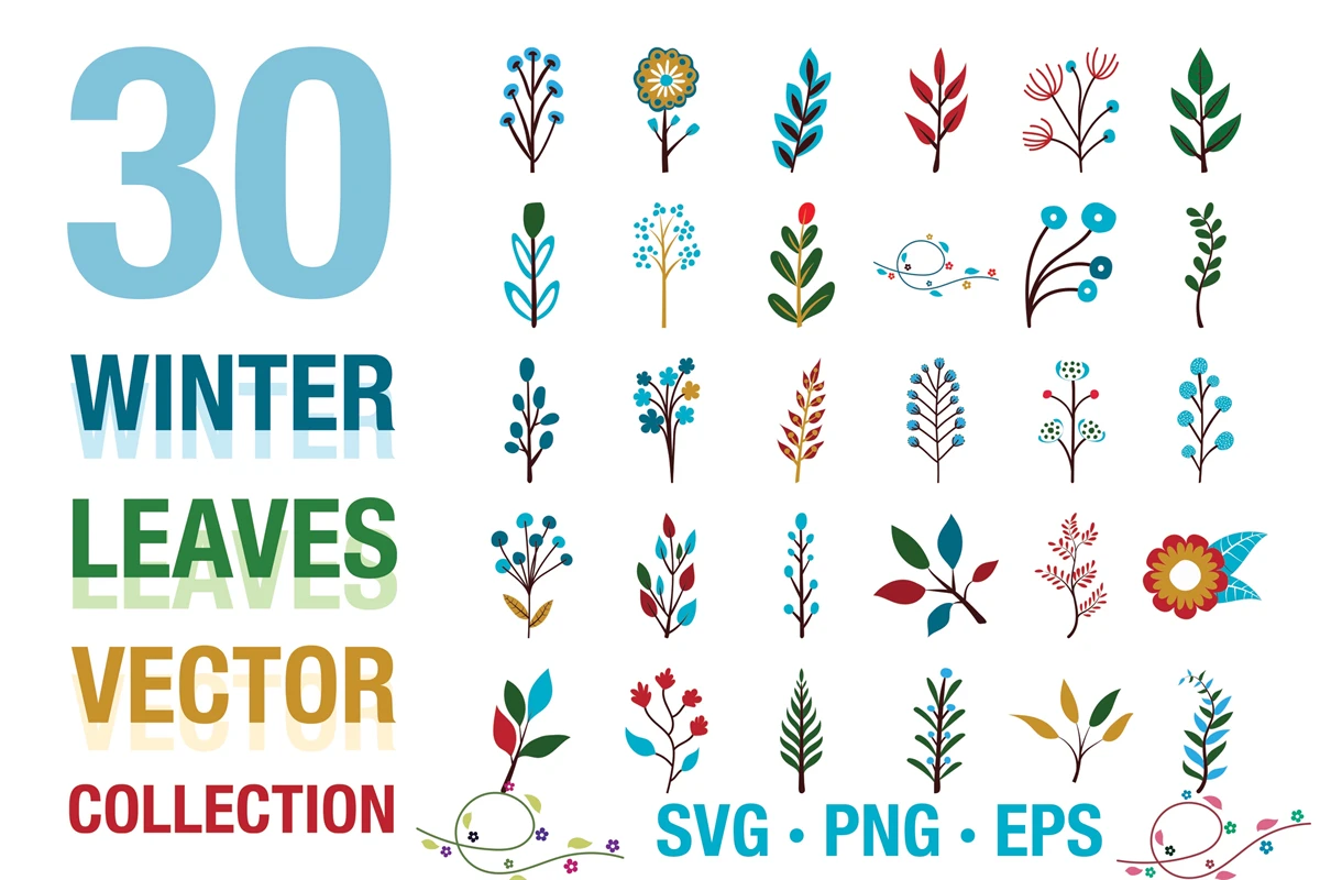 A collection of 30 winter leaves and flowers.
