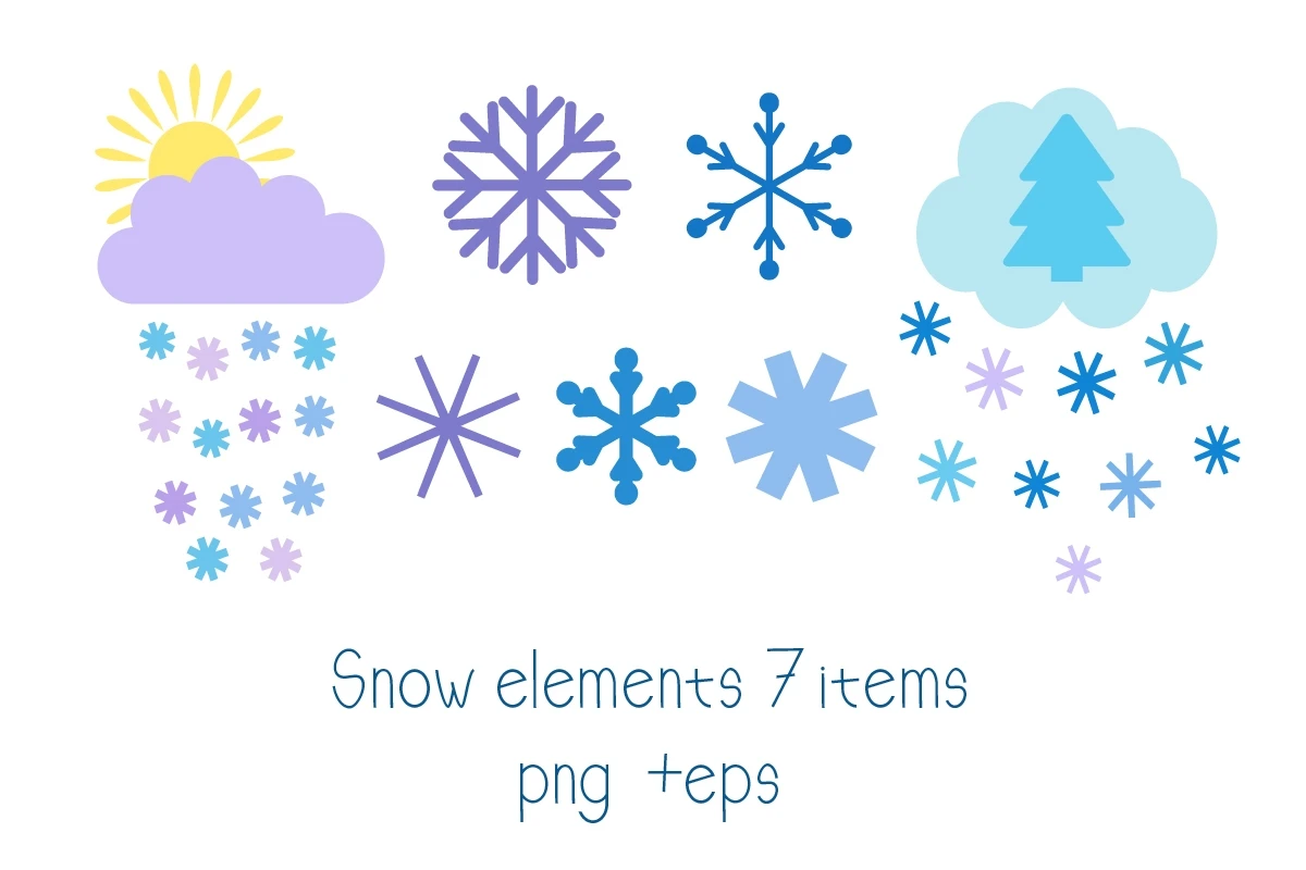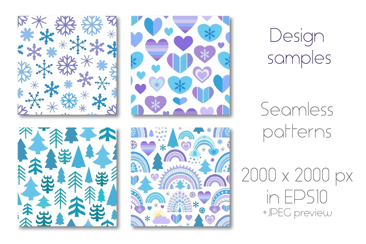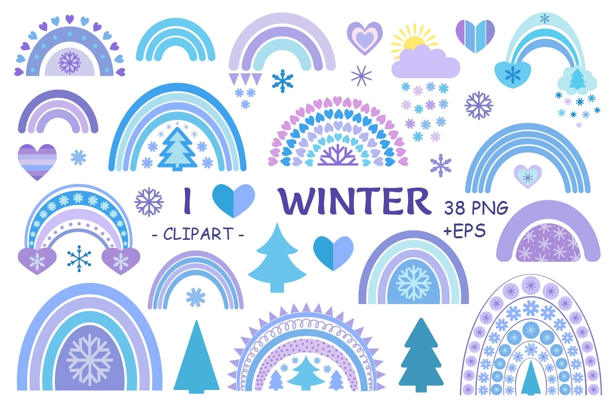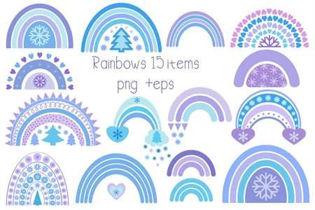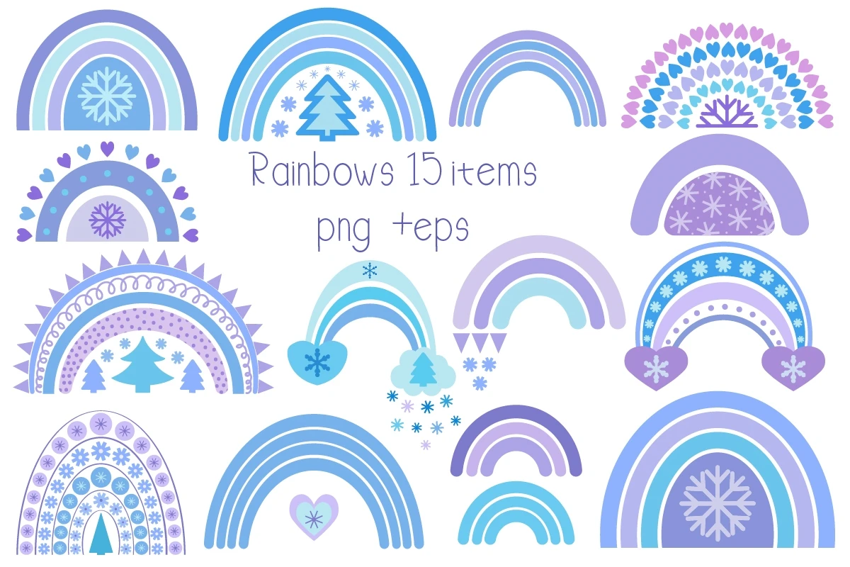 The delightful collection of winter rainbow elements: rainbows, snowflakes, trees, hearts. High quality clipart in raster (PNG) and vector (EPS) formats. Create original design on theme of Christmas, New Year, cozy winter. Cute rainbow illustrations in blue and green colors.