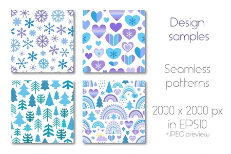 - design samples (4 seamless patterns in EPS format 2000 x 2000 px + JPEG preview + PNG on transparent background)