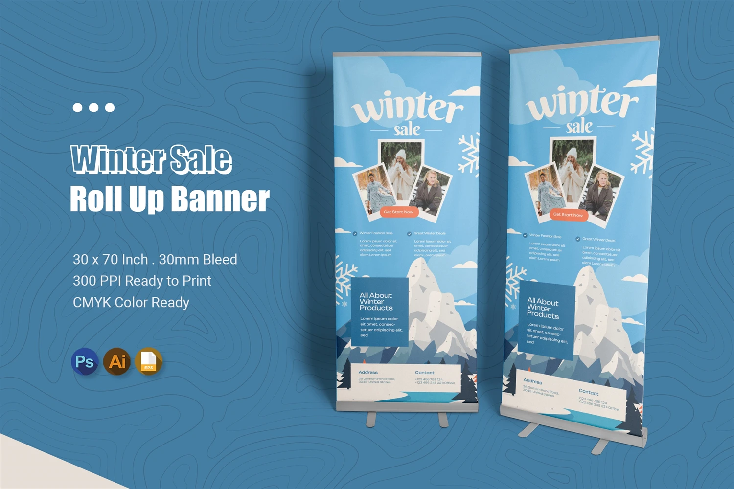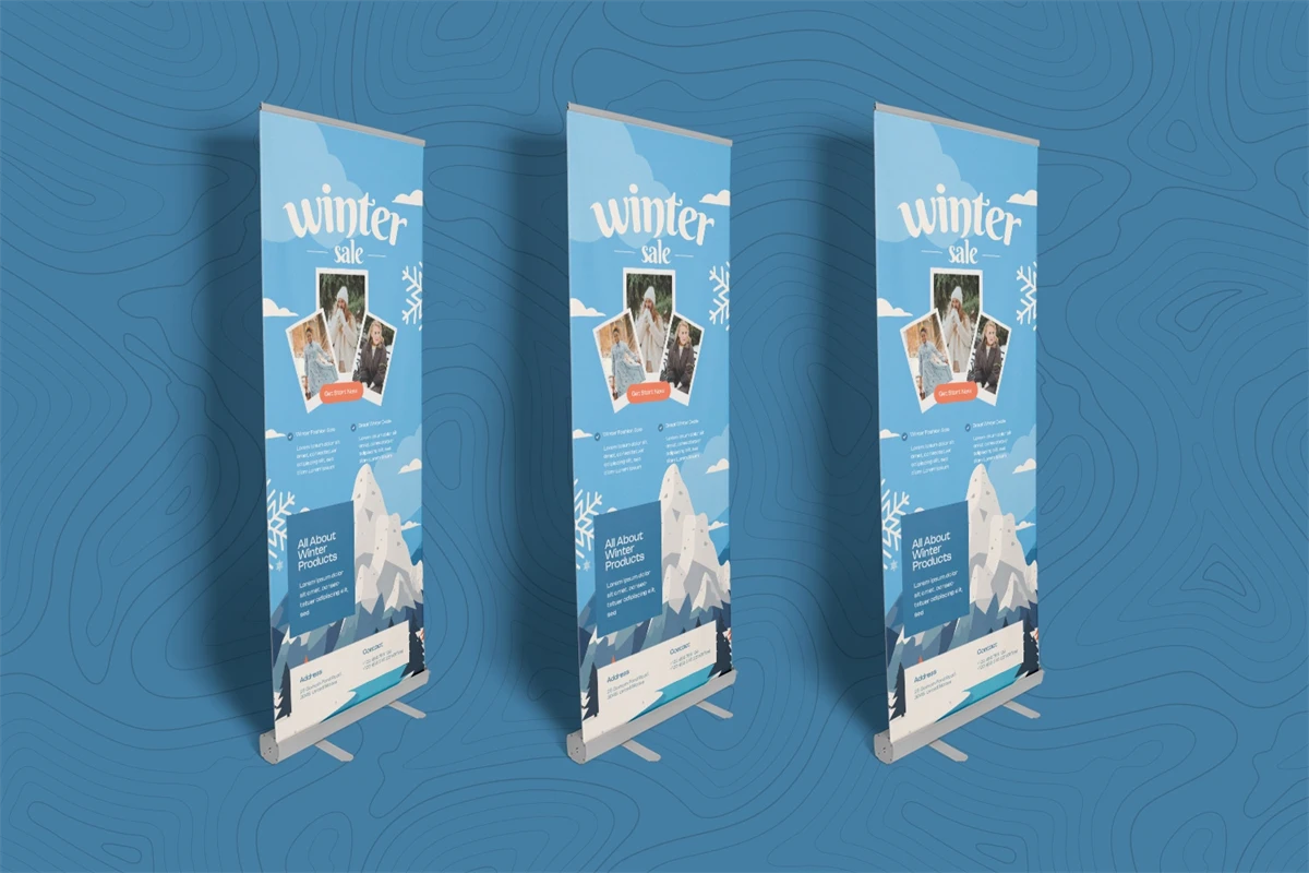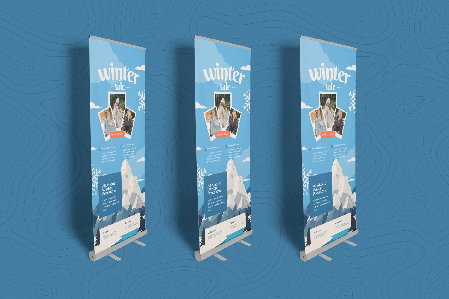 Our roll-up banner template tells your brand's story at a glance. This design stands out and can be used to showcase pictures and content effectively.
