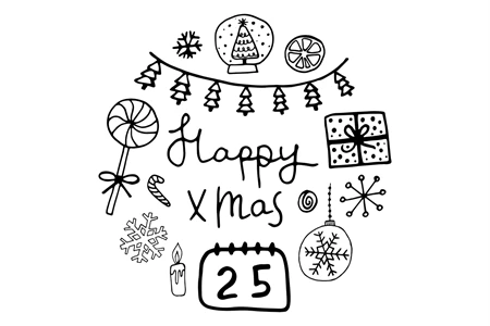 Doodle collection of Christmas illustrations. Round holiday card for New Year, Christmas, winter events. For design of stickers, prints, sublimations, postcards, packaging, emblems, posters, paintings. Christmas tree, pine tree, Christmas ball, fir branch, gift, snowflakes, candy, champagne