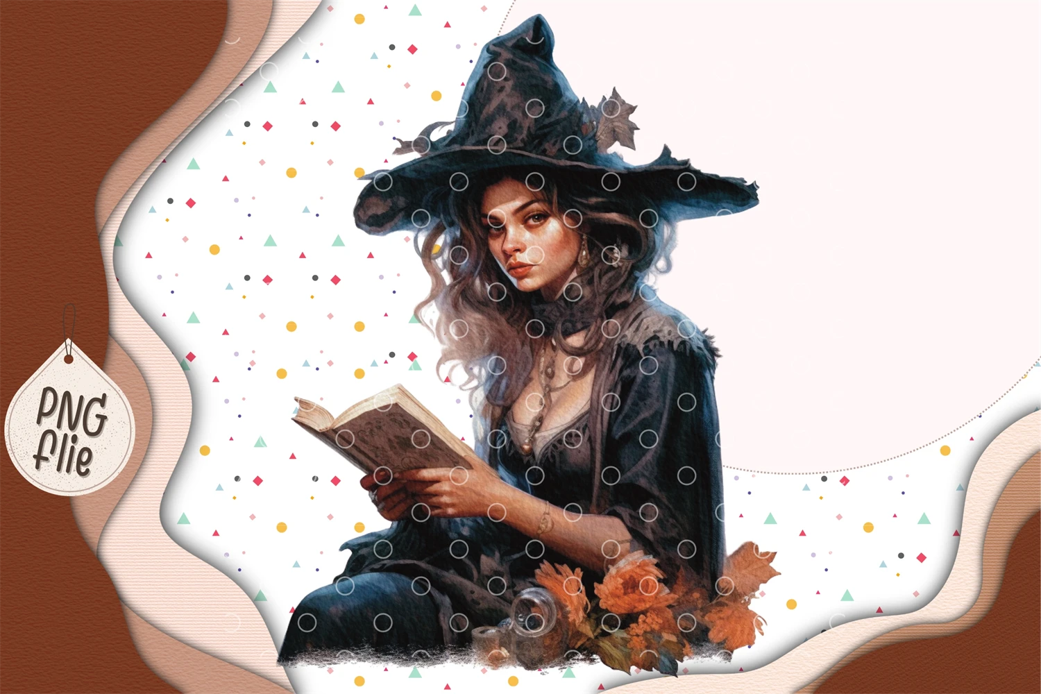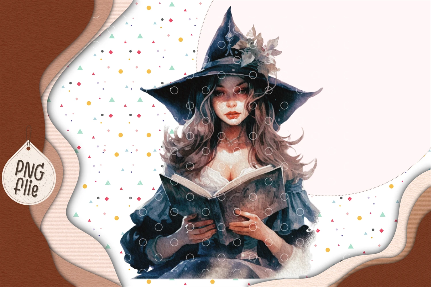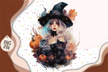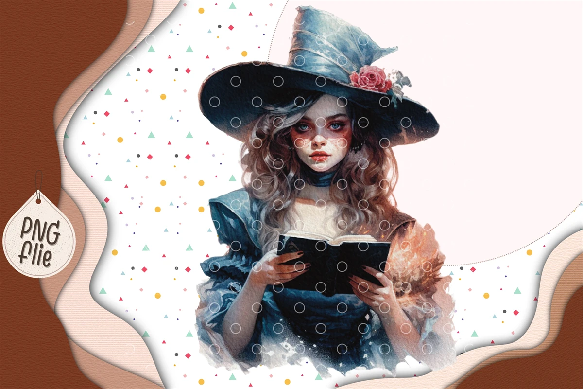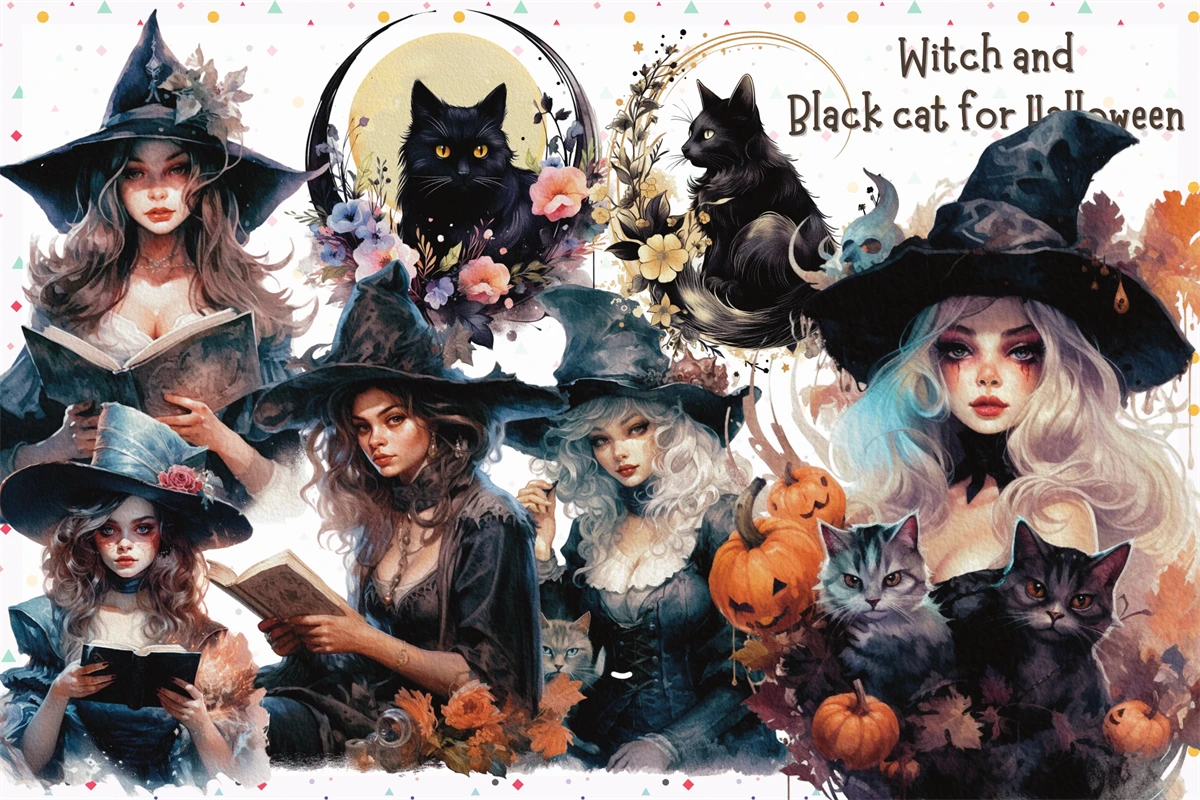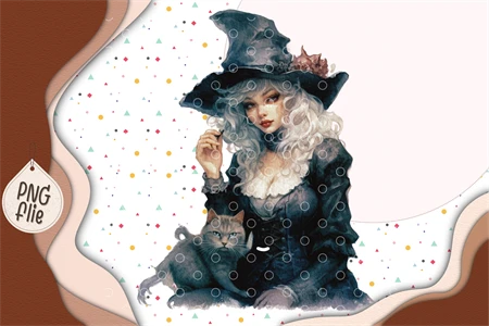 Witch holding spells book and black cat in Watercolor for Halloween