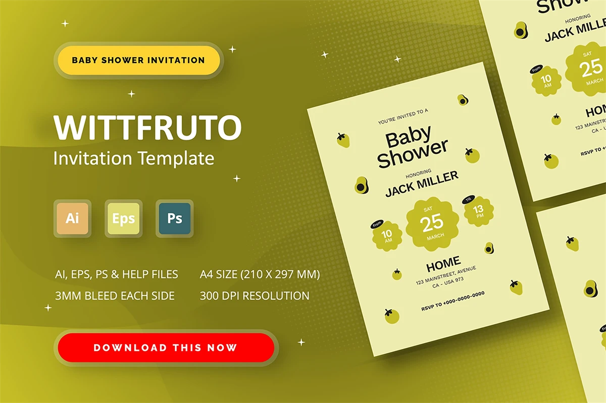 Wittfruto - Baby Shower Invitation Use this Invitation Template to celebrate special moments like baby showers, weddings, birthdays, parties, and graduations. You can easily edit the text and change the colors to suit your preferences!