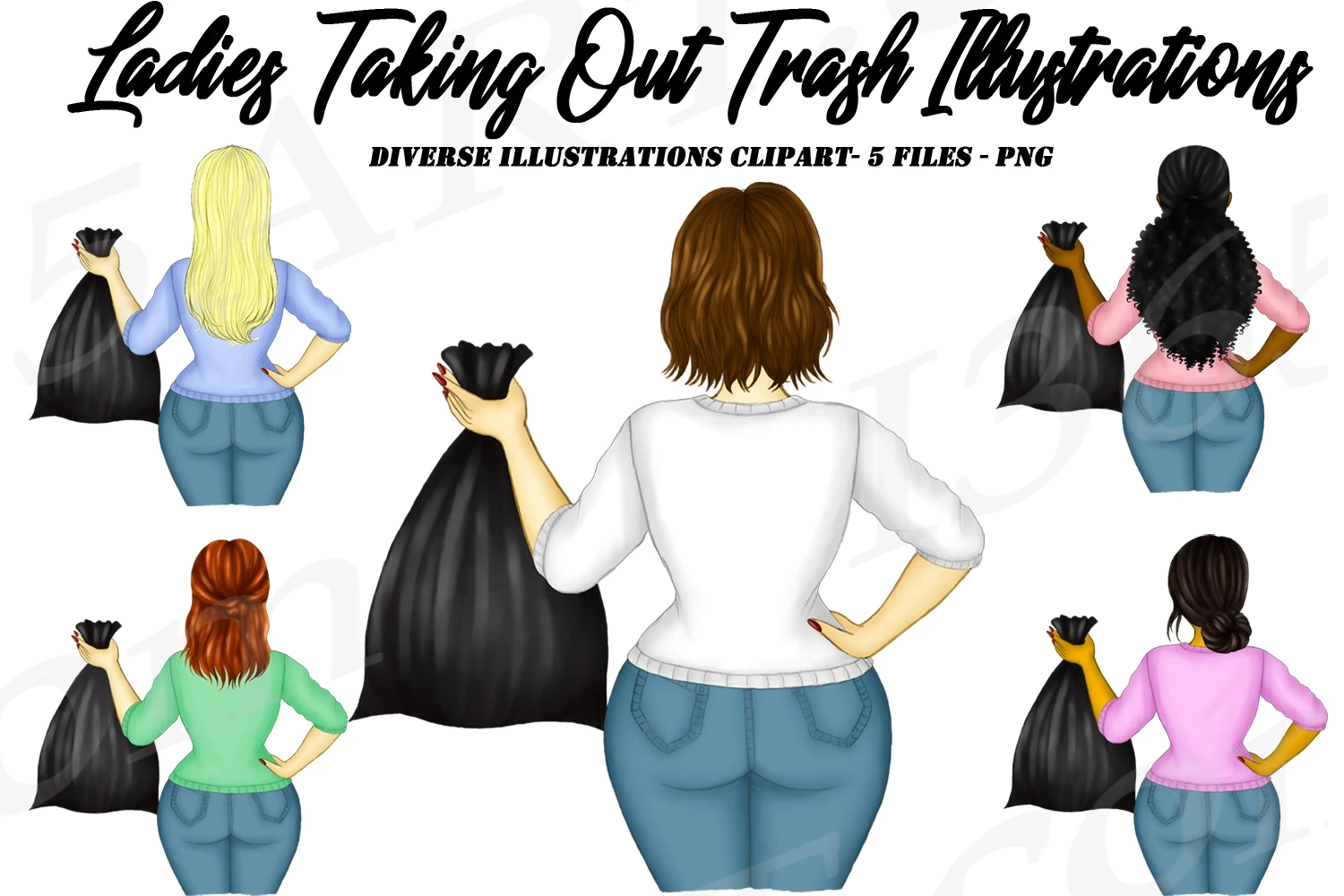 5 diverse women taking out trash png clipart. Can be used in various projects including planner stickers, stationary, scrapbooking, party invitations, crafts, decorations and more!