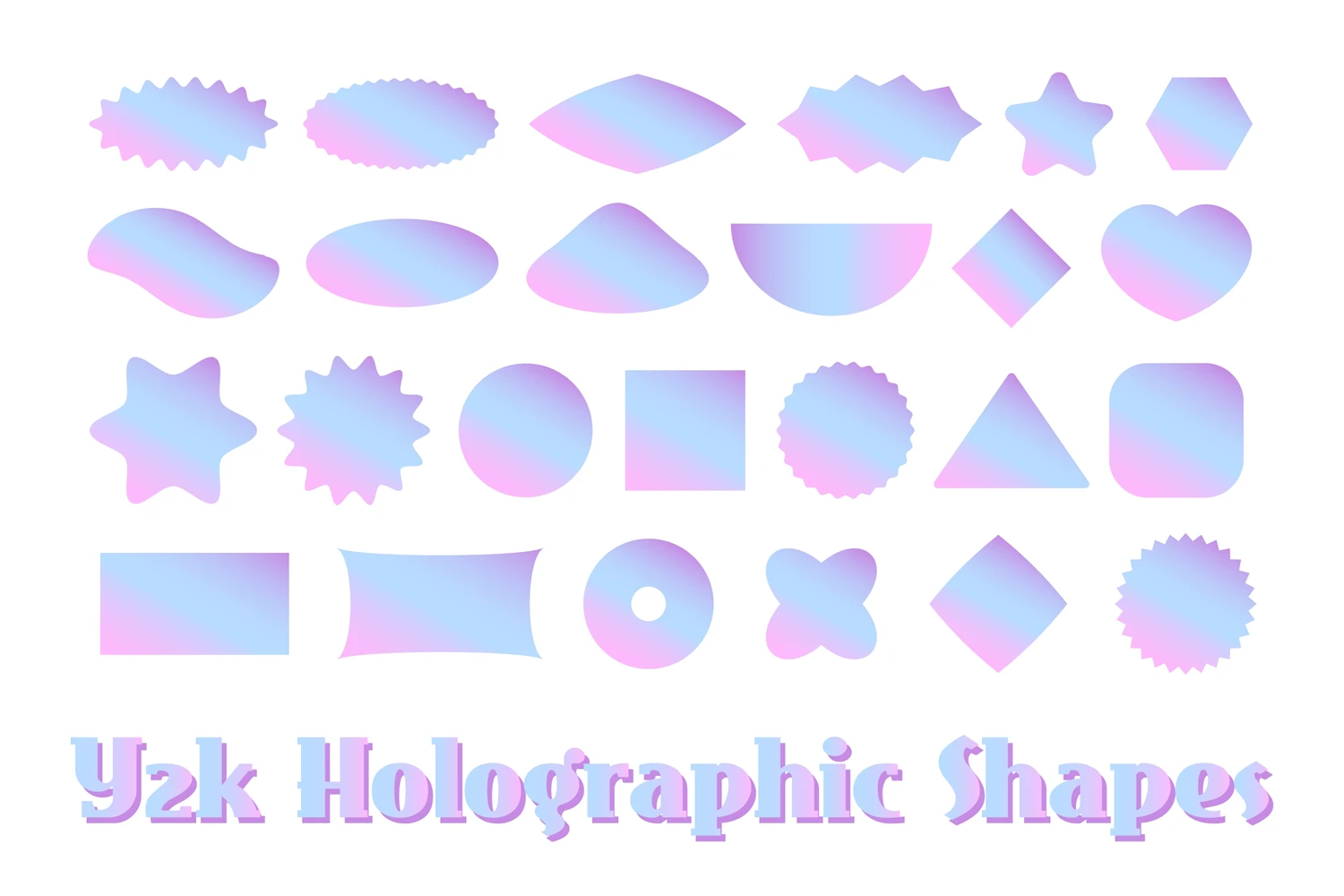 Abstract gradient holographic shapes. Y2k geometric shapes. Trendy Y2k scalloped frames and borders with neon rainbow colors. Vector illustration. Colorful textured backgrounds. Futuristic shapes with gradient effect.