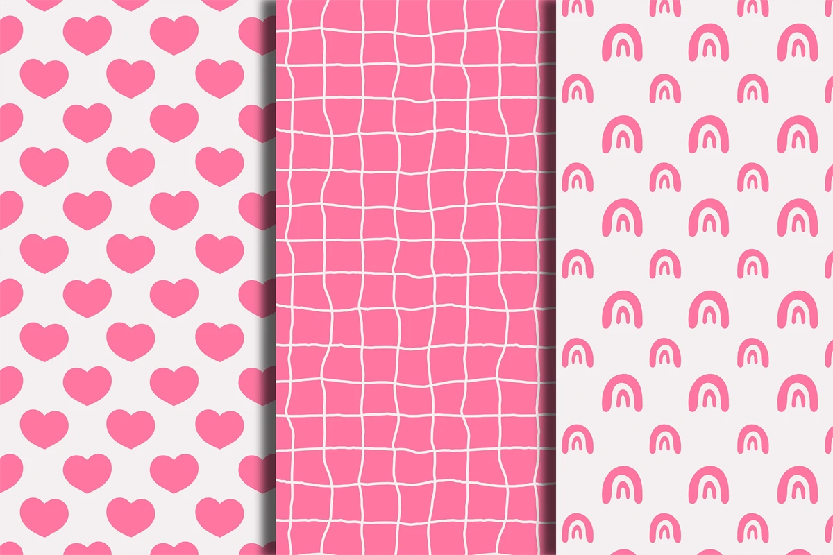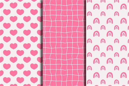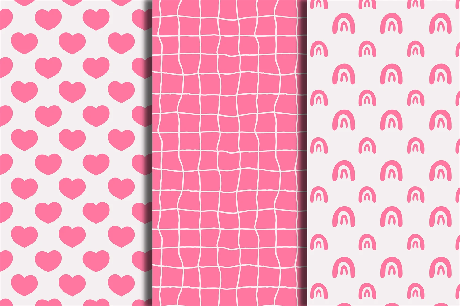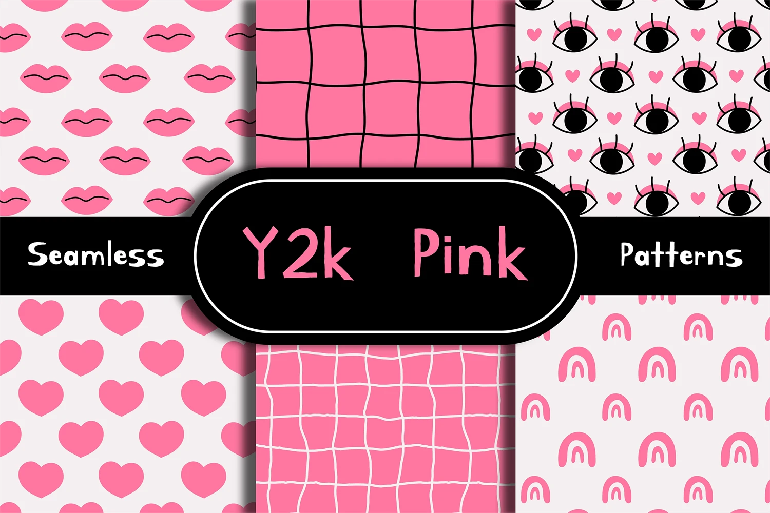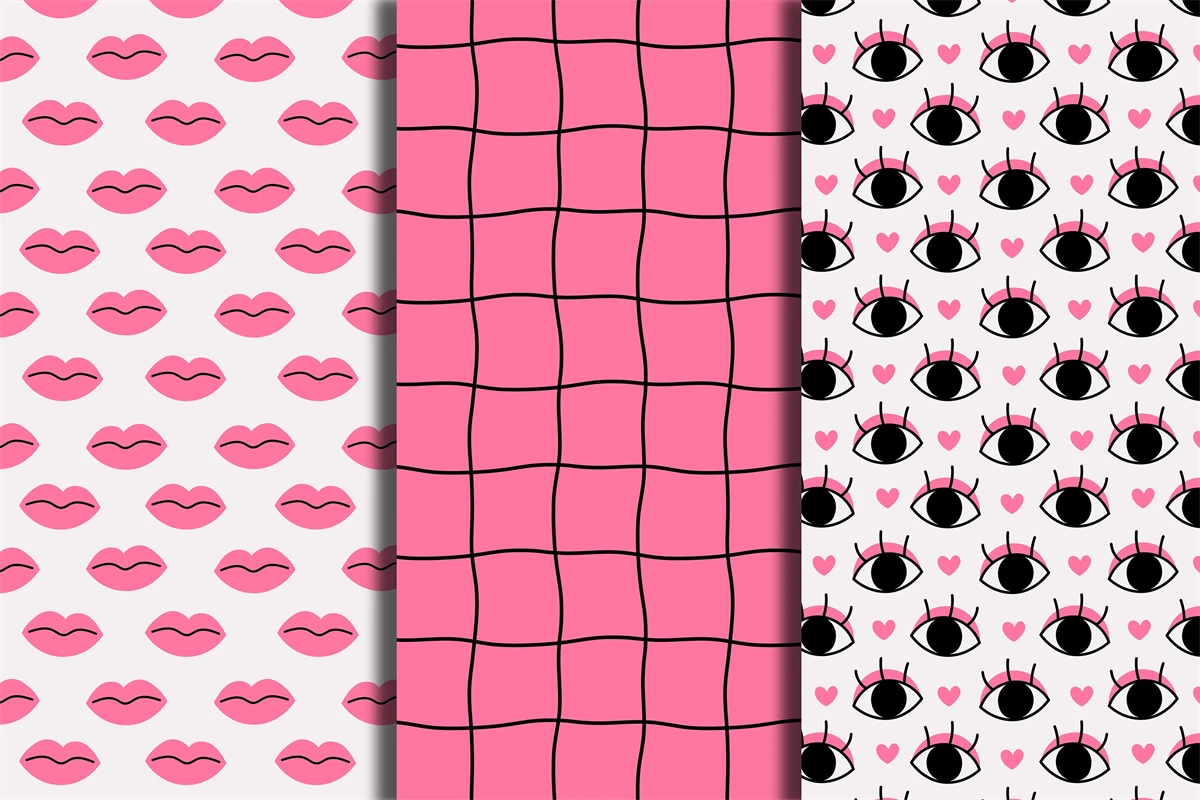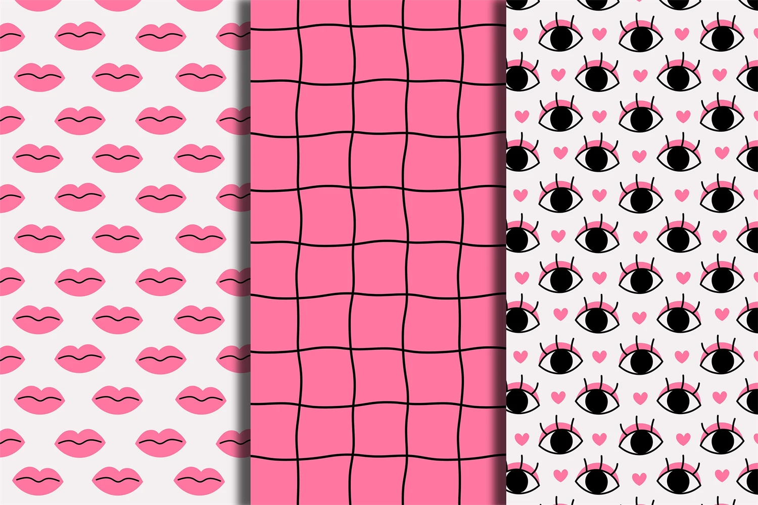 Trendy Y2k glamorous pink seamless patterns bundle. Cute modern pinkcore endless backgrounds and digital papers with minimal 90s design are perfect for girls, woman and kids. Hand-drawn abstract twisted grid, lips, hearts, eyes, curves, lines and rainbows for wedding, Valentines day, fashionable textile, fabric, greeting card, wallpaper, scrapbooking, junkbooking, decoupage, cover, etc. Romantic retro aesthetics.