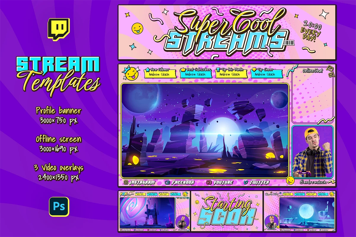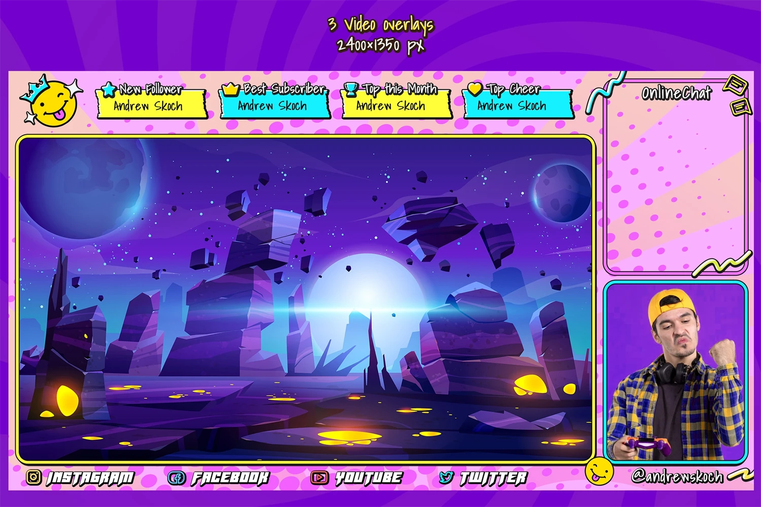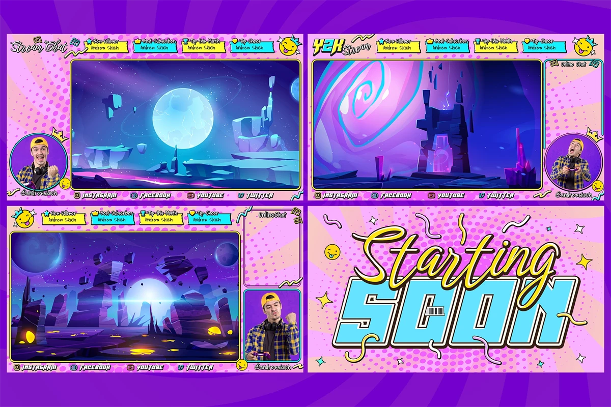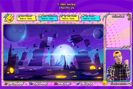3 video overlays for streamers, offline screen and profile banner. Get back to the year 2k with these funny templates. Cheerful colors for your funny streams. Cute nostalgic elements created with a bit of nostalgia. Edit texts and go. It's so easy!
