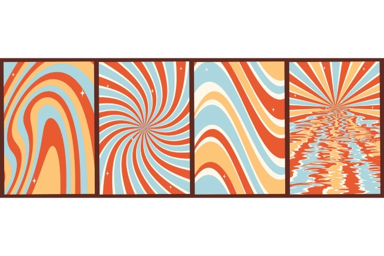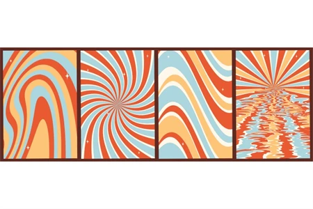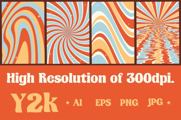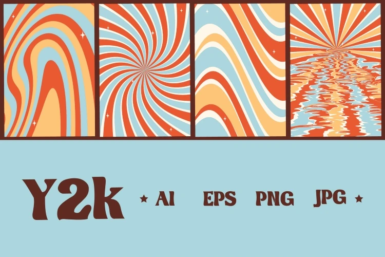 Set of colorful abstract backgrounds.Groovy rainbow backgrounds.Y2k aesthetic.Vector cards in retro psychedelic style.Vector set.Trendy retro 90s style.Template for print.Designs for covers.Vector illustration of y2k.Nostalgia for 1980s.2000s.Designs for packaging.Groovy backgrounds.