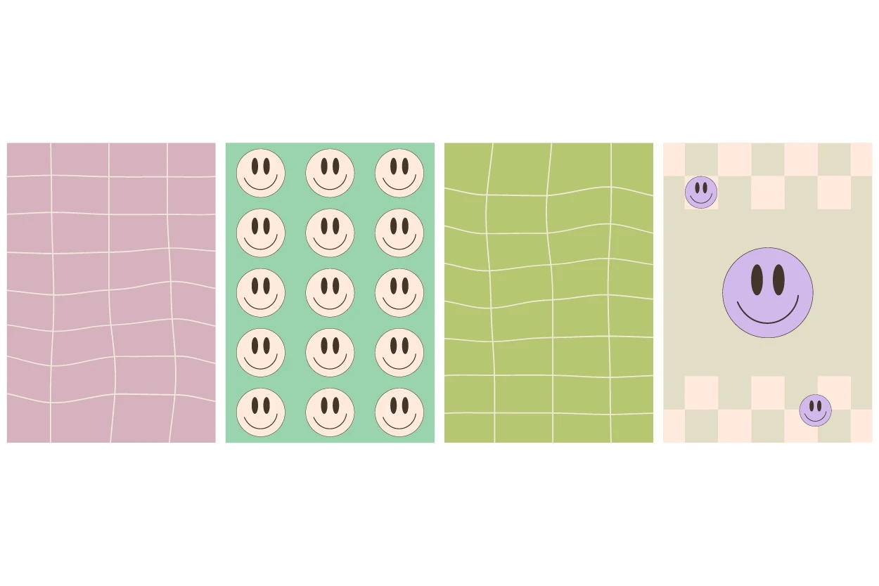 Set of colorful abstract backgrounds.Y2k aesthetic.Vector cards in retro psychedelic style.Groovy backgrounds.Vector set.Trendy retro 90s style.Template for print.Designs for packaging.Designs for covers. Nostalgia for 1980s.Vector illustration of y2k.2000s.