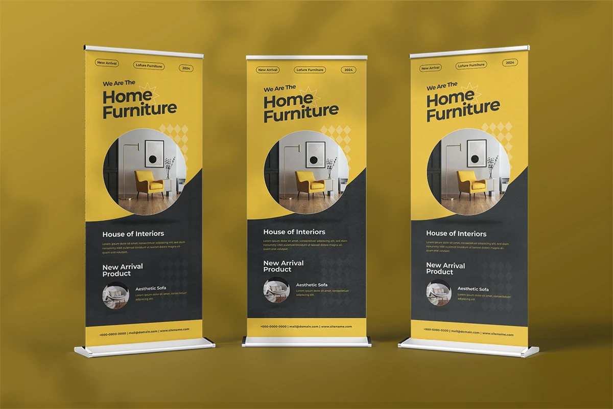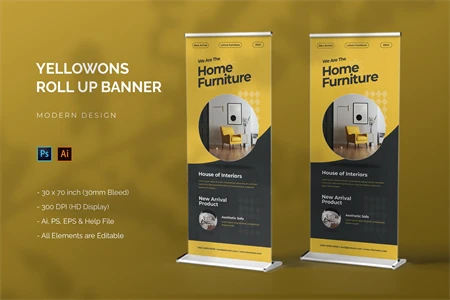 This is **Yellowons - Roll Up Banner** Don't wait, get it right now! , All Your Roll-Up Banner Needs, Professional or Personal. This stylish and adaptable template is perfect for your company's promotional materials.