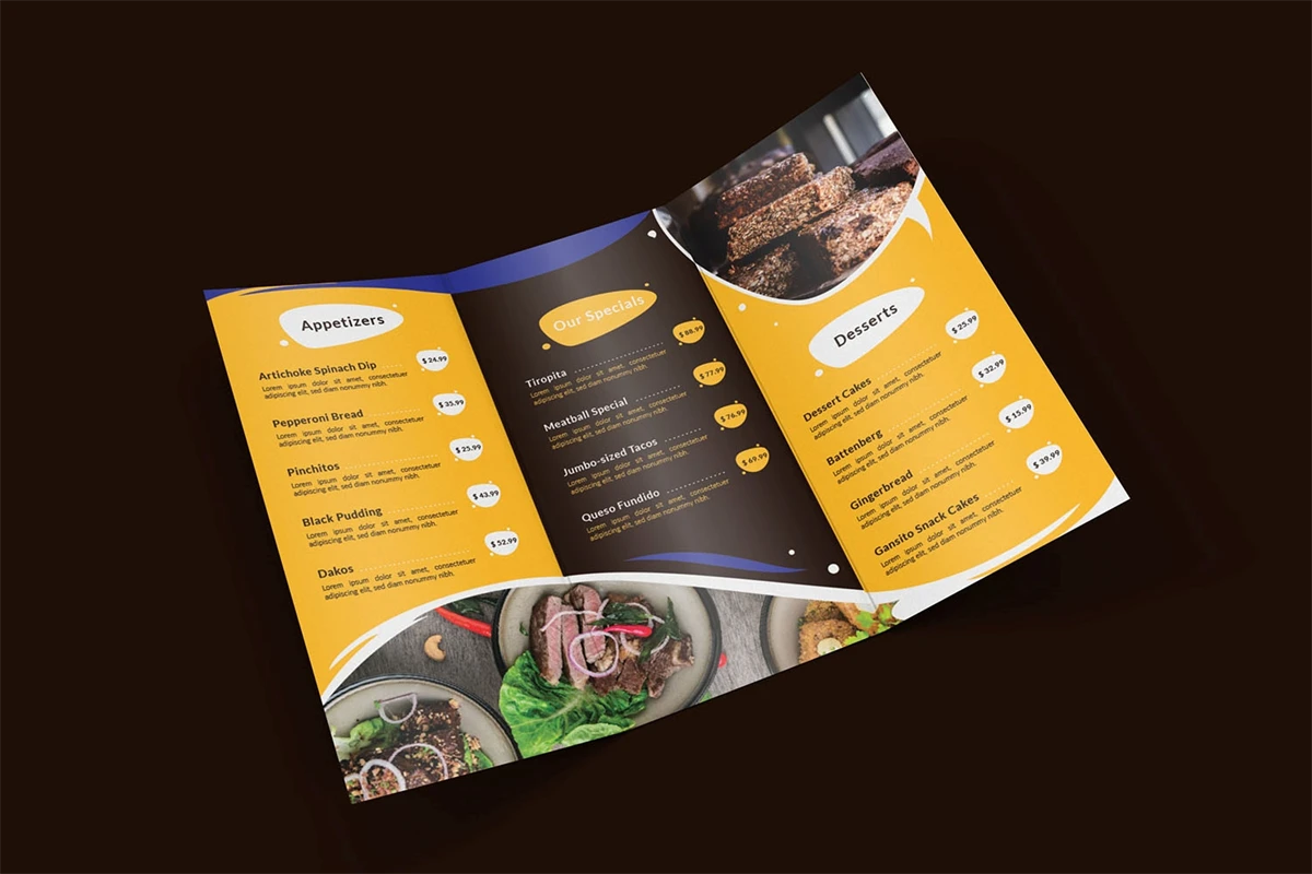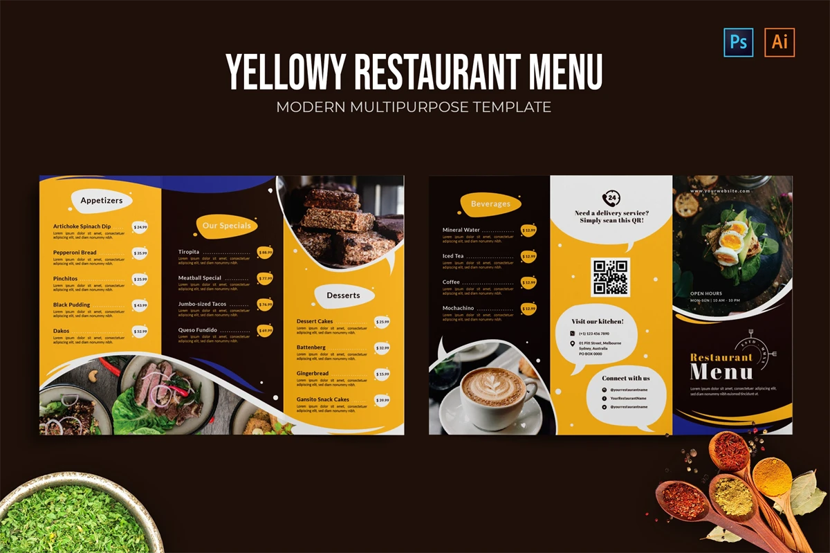 Yellowy - Restaurant Menu. This template is great for your business and will make your customers interested, elegant, and easily editable according to your needs, this restaurant menu is perfect for, promos, cafes, hotels, resort shops online. etc. I hope you enjoy this restaurant menu